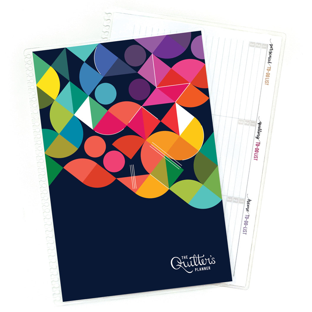 The inside front cover features a full-page to-do list broken down by category. The inside back cover is a dot grid page to make lists, plan, draw your next quilt idea or whatever you'd like.